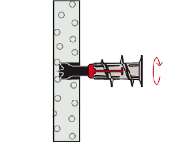 plug wordt in de gipsplaat geschroefd met een (accu) schroefmachine waarbij de plug vlak tegen het oppervlak van de