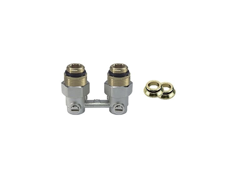 Gebruik het H-aansluitblok tweepijp eurocone haaks M 3/4" met 2 aansluitingen M 3/4" voor je boiler.