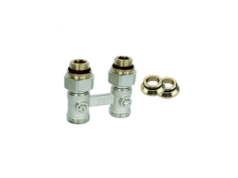 Dit H-onderblok van Saninstal dient om uw radiatorbuizen aan te bevestigen. U ontvangt hiernaast ook 2 aansluitingstukken.